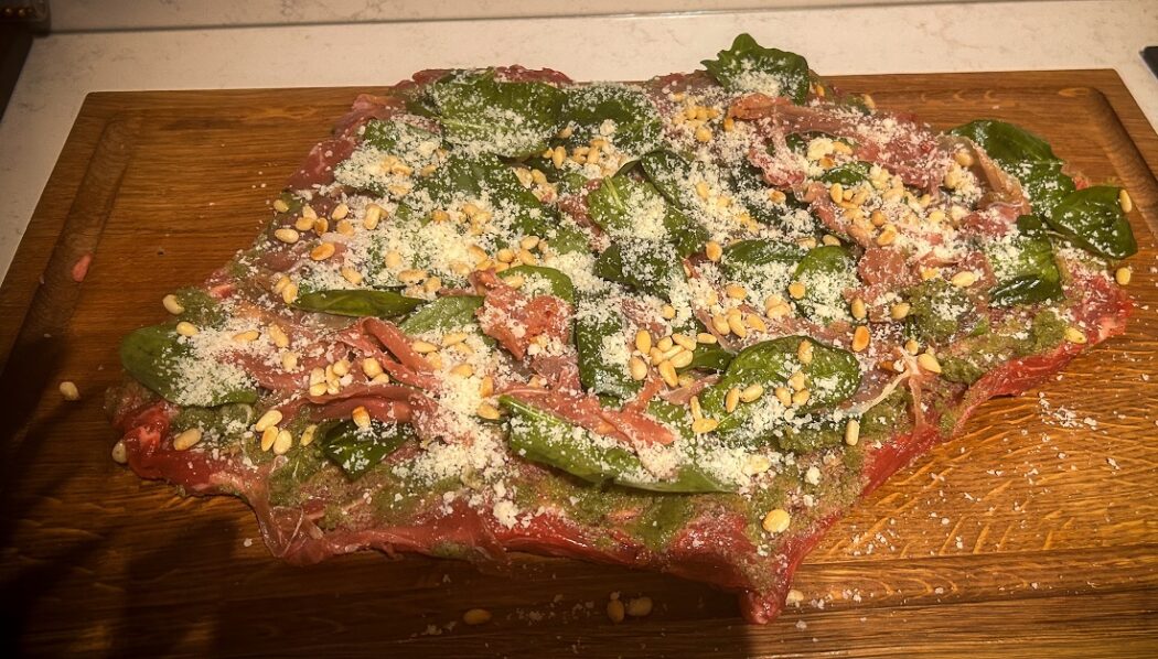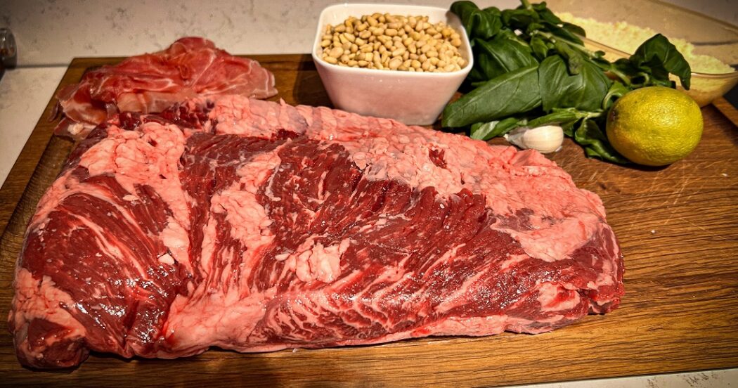 Deze gevulde Australische wagyu bavette rollade van het spit is hét ultieme gerecht voor BBQ-liefhebbers die indruk willen maken. Dankzij de rijke marmering van wagyu blijft de bavette ongekend sappig tijdens de bereiding op de rotisserie. Gevuld met huisgemaakte groene pesto, parmaham en Parmezaan is dit een luxueus Kamado recept dat verrassend eenvoudig te maken is.