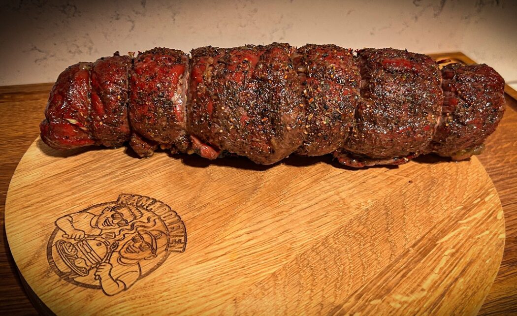 Op de Kamado kun je deze gevulde bavette rollade goed bereiden. Zoals aangeven is dit gerecht niet op de klassieke manier gemaakt, maar met de rotisserie. Zorg voor een juiste en constante temperatuur en de rotisserie zal voor jou het werk doen. Door het constante draaien gaart het vlees gelijkmatig en blijft het ongekend sappig. De vulling trekt tijdens het garen diep in het vlees en versterkt de natuurlijke, volle smaak van de bavette. Door de bereiding op de Kamado krijgt het een heerlijke barbecue smaak en door de directe bereiding zal er een prachtige goudbruine buitenkant ontstaan. Let goed op dat je tijdens het aansnijden haaks op de draad snijdt, zodat je een heerlijke malse bavette rollade krijgt.